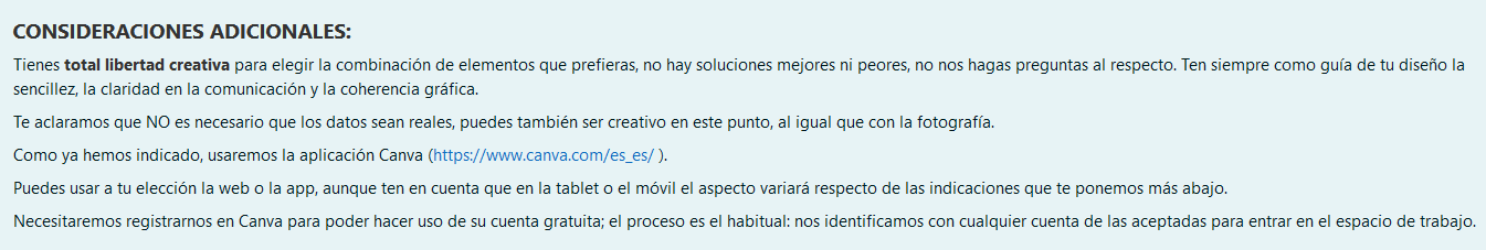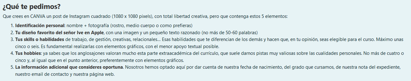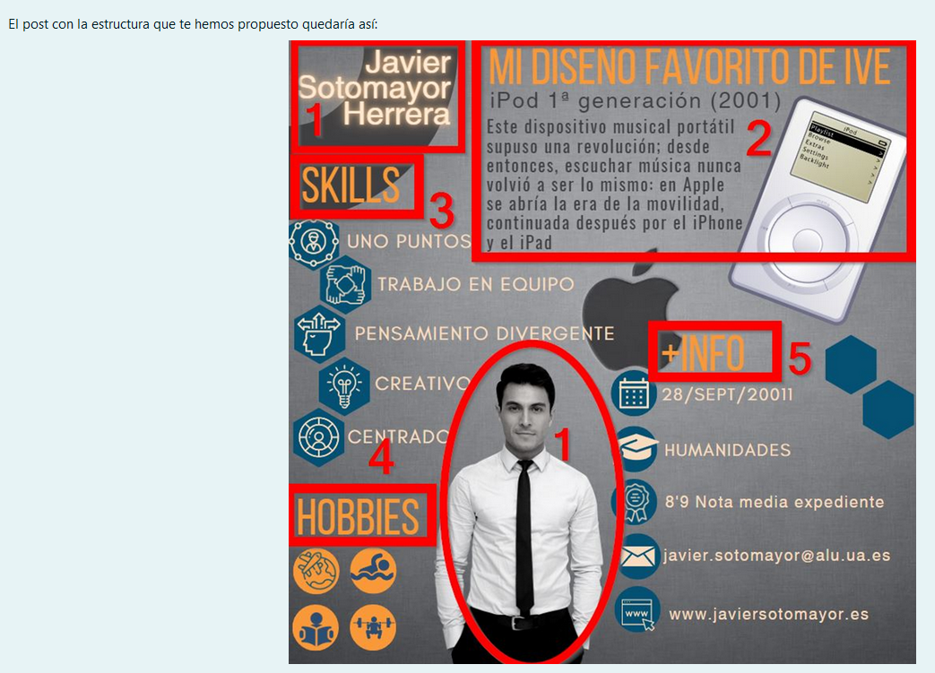 Lo que tienes que hacer en esta tarea está escrito en el enunciado, pero te lo resumo en pocas palabras: un currículo gráfico resumido de tus habilidades para que, en un supuesto curso de diseño, te escojan a ti. Tienes un ejemplo gráfico en el mismo enunciado a modo de guía, pero los alumnos tienen total libertad creativa.