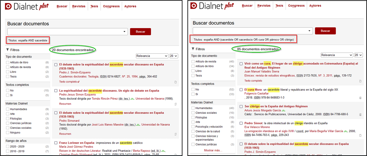 - Para incorporar otras formas de referirnos a un mismo concepto (palabras derivadas, sinónimos...). Es una manera de ampliar la búsqueda. Por ejemplo, para localizar documentos sobre el sacerdocio actual en España, puedo pensar en palabras clave como sacerdote / sacerdocio / cura / párroco / clérigo. Si no tengo en cuenta esas diferentes palabras, no podré recuperar los documentos que las han utilizado. La partícula que los une es el OR (en el catálogo se puede escribir en castellano: O): sacerdote OR sacerdocio OR cura OR párroco OR clérigo. En la siguiente imagen de una búsqueda en Dialnet, se muestra la diferencia entre utilizar un único término o el de usar varios sinónimos de ese término.