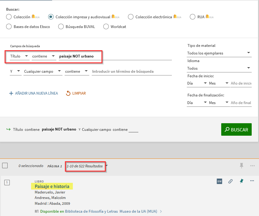 - Para eliminar aspectos cuando queremos recuperar documentos sobre un tema, pero que no sean de un aspecto concreto. Por ejemplo, documentos que traten sobre el paisaje, pero que no sea el paisaje urbano (puede ser paisaje industrial, paisaje agrario, paisaje montañoso...). La partícula que sirve para indicar que los documentos contienen el primer término, pero excluyen el segundo, es el NOT (en el catálogo se puede escribir en castellano: NO): paisaje NOT urbano. Es un operador restrictivo, pero menos que AND. Hemos pasado de 26 resultados con la búsqueda de paisaje AND urbano, a 522 resultados en la búsqueda paisaje NOT urbano (hemos recuperado documentos sobre otros tipos de paisaje diferentes al urbano).
