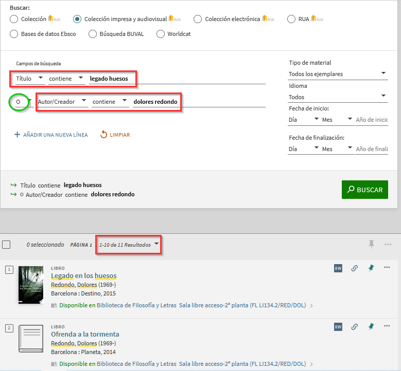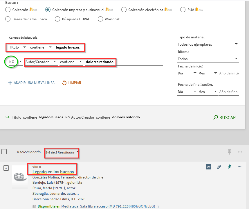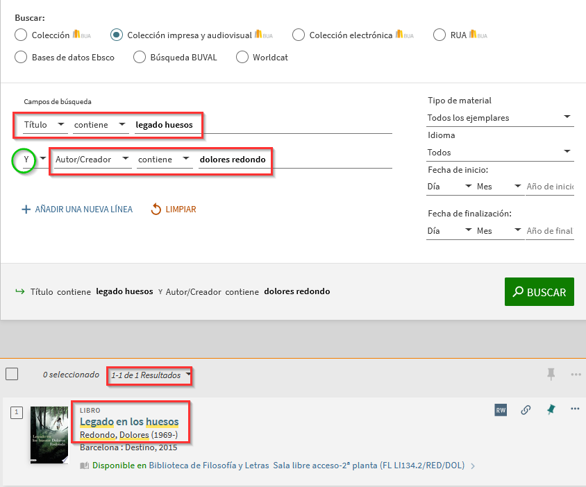 Respecto a los operadores booleanos, son partículas que nos ayudan a relacionar las palabras clave que quiero incluir en una búsqueda. Pueden combinar palabras en un mismo campo, o combinar distintos campos entre si ( por ejemplo, palabras en el título y el autor de la obra).