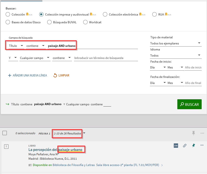 - Para unir conceptos en una búsqueda. Es más restrictiva. Por ejemplo documentos que traten sobre paisaje urbano: los documentos que recuperemos tienen que tener, en su título, su resumen o sus palabras clave, esos dos términos: paisaje / urbano. La partícula que los une es el AND (en el catálogo se puede escribir en castellano: Y), y cuando no escribimos ninguna partícula es la que está por defecto: paisaje urbano = paisaje AND urbano