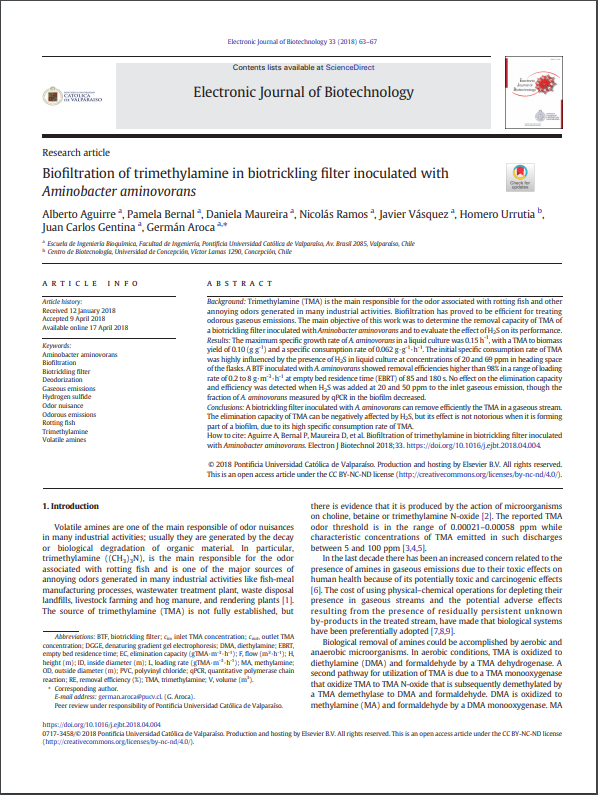 AGUIRRE, Alberto, et al. Biofiltration of trimethylamine in biotrickling filter inoculated with Aminobacter aminovorans. Electronic Journal of Biotechnology [en línea]. Valparaíso (Chile): Pontificia Universidad Católica de Valparaíso, 2018, vol. 33, pp. 63-67 [consulta: 16 de julio de 2018]. ISSN 0717-3458. Disponible en: https://doi.org/10.1016/j.ejbt.2018.04.004