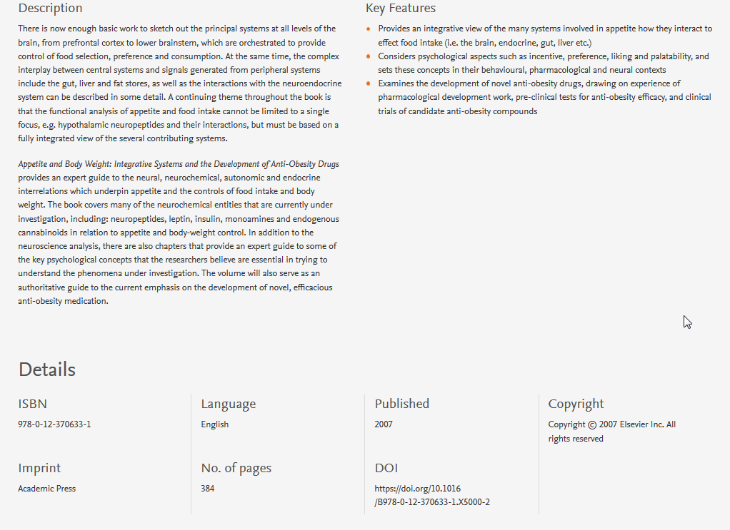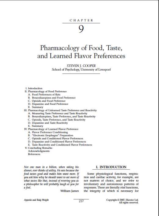COOPER, Steven J. Pharmacology of Food, Taste and Flavor Preferences. En Tim C. KIRKHAM y Steven J. COOPER, eds. Appetite and Body Weight. Nueva York: Elsevier, 2007, pp. 217-245 [consulta: 3 de julio de 2018]. ISBN 978-0-12-370633-1. Disponible en: https://www.sciencedirect.com/science/article/pii/B9780123706331500098