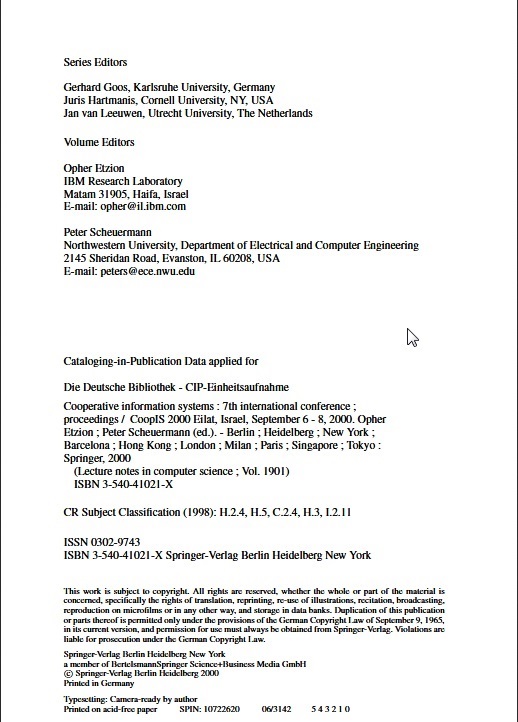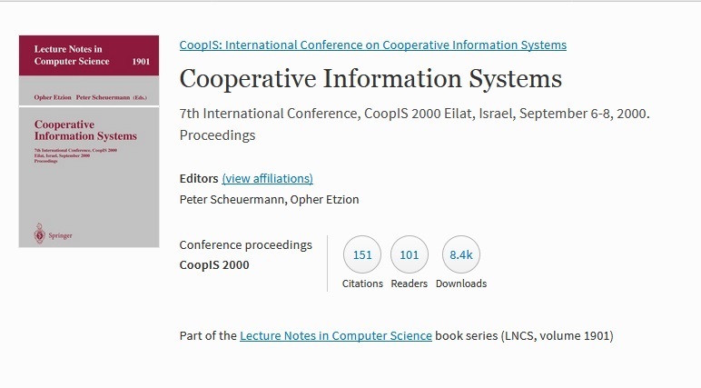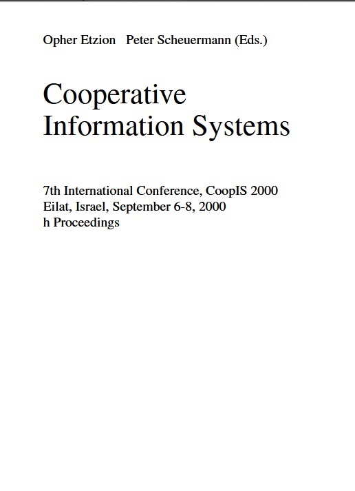 SCHEUERMANN, Peter y Opher ETZION, eds. Cooperative Information Systems: 7th International Conference, CooPIS 2000, Eilat, Israel, September 6-8, 2000. Proceedings [en línea]. Berlín: Springer, 2000 [consulta: 15 de julio de 2014]. ISBN 978-3-540-45266-9. Disponible en: https://link.springer.com/book/10.1007/10722620